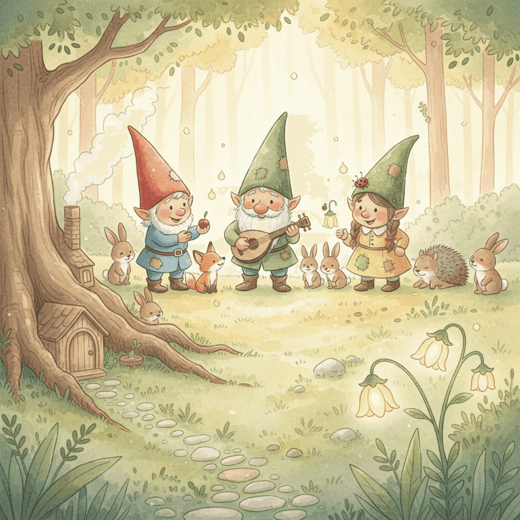 Сказочный сад: гномы чинят, сажают и мирят — с добрым юмором и уютными итогами.